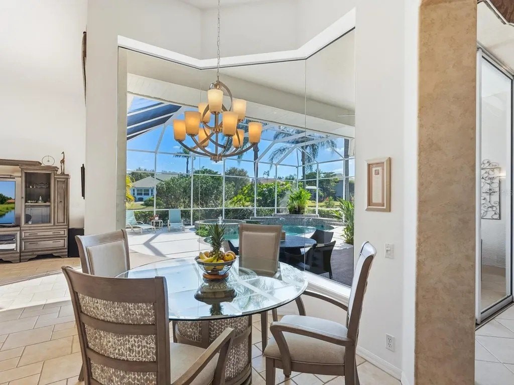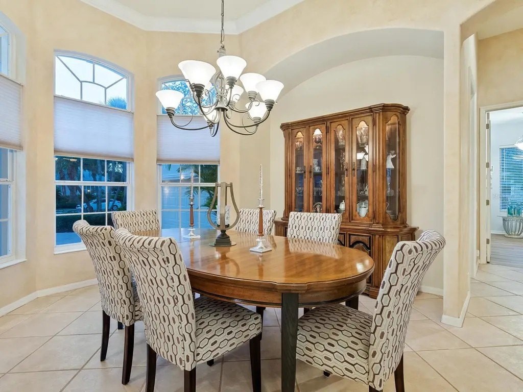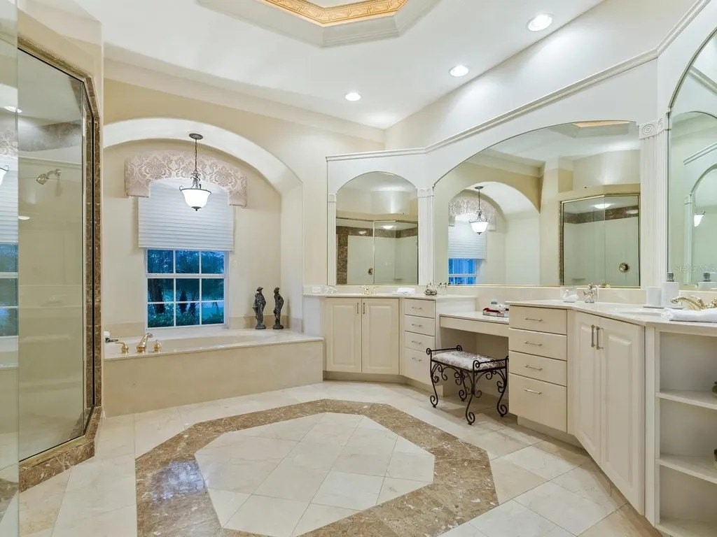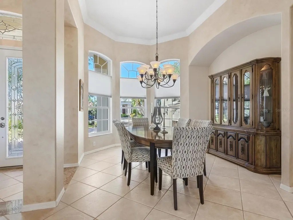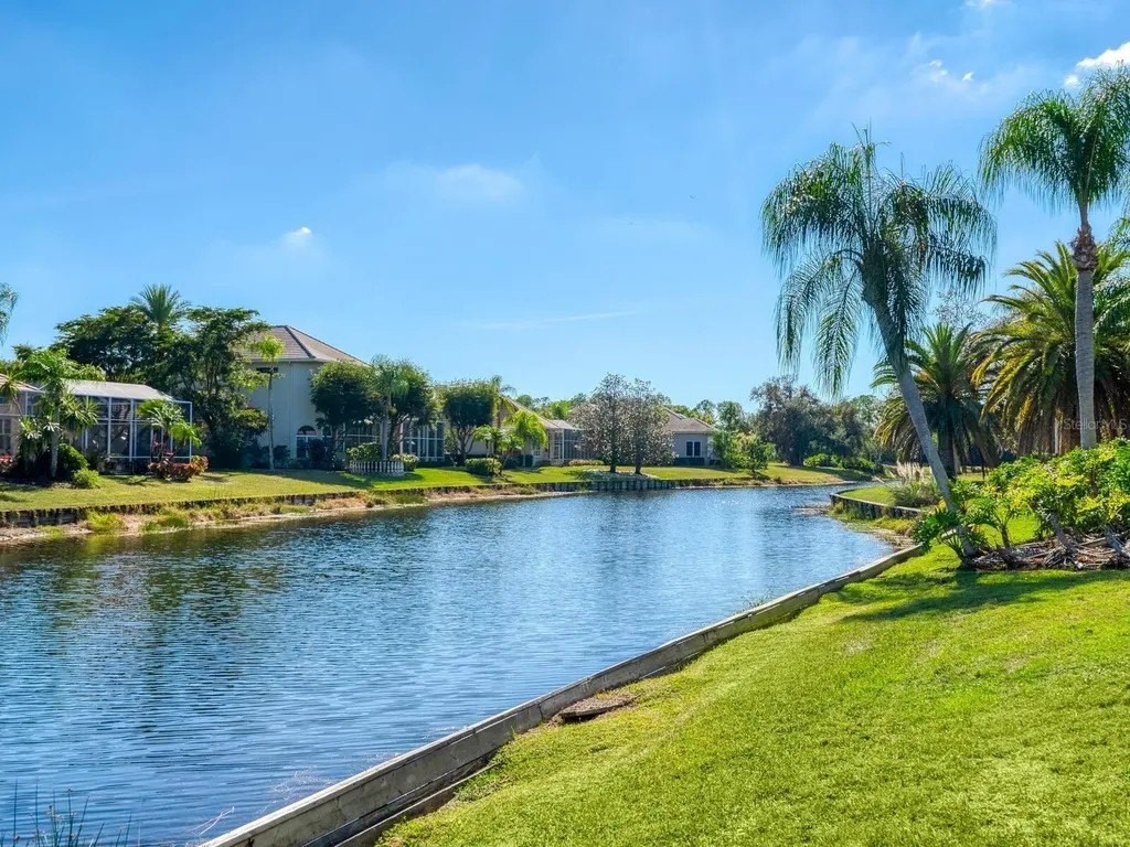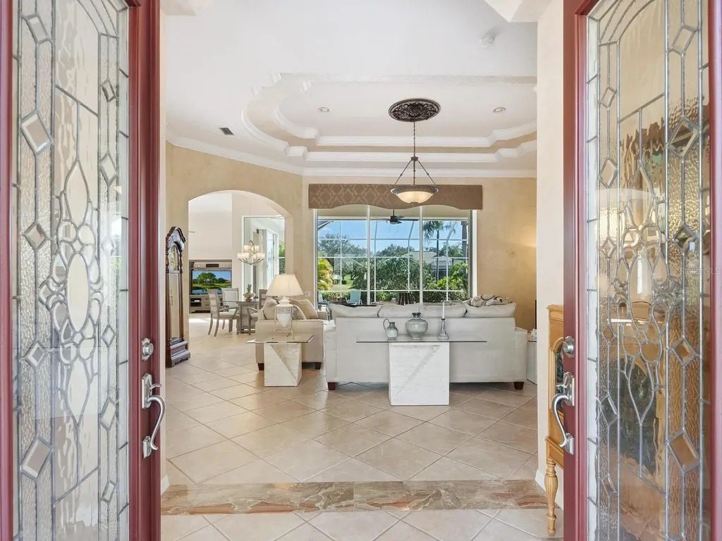 Welcome to this beautifully appointed Neal Custom Homes residence offering serene water views, exceptional architectural detail, and resort-style outdoor living. This 3-bedroom, 3-bath home with an oversized 3-car garage offers 3356 sf and is thoughtfully designed for both everyday comfort and elegant entertaining. A double designer leaded-glass front door opens to a striking foyer with marble inlay flooring, setting the tone for the refined interiors. High-end ceramic tile laid on the diagonal flows throughout the main living areas, complemented by tray and coffered ceiling details, crown molding, custom niches, and recessed lighting. The living room features a triple tray ceiling, an electric fireplace, and pocket sliders that open seamlessly to the lanai. The brand-new kitchen (2021) is the heart of the home, showcasing rich off-white wood cabinetry, exotic granite countertops, a quartz-topped center island, GE stainless steel appliances, subway tile backsplash, under-cabinet lighting, a spacious pantry, built-in oven with microwave, and an aquarium window in the breakfast area. Open to the family room and lanai, this space is ideal for entertaining. The primary suite is a private retreat featuring a sitting area with bay-style windows, coffered ceiling, dual customized closets, double-door entry, and private access to the lanai. The spa-inspired, wheelchair-accessible primary bath offers an oversized marble-detailed shower, Jacuzzi tub, marble flooring, expansive double vanity with makeup area, cultured marble countertops, triple mirrors, and new designer hardware. Bedroom two is a generously sized custom suite with a large closet and bath featuring a cultured marble vanity and tub/shower combination. Bedroom three is adjacent to a full hall bath with enclosed shower, linen closet, and updated brushed-silver fixtures. A large rear den with cathedral-style ceiling and sliders to the lanai can easily serve as a fourth bedroom with the addition of a closet. Step outside to your private oasis with a kidney-shaped heated pool and spa, lush updated landscaping with lighting, and a covered lanai offering space for a future outdoor kitchen (currently equipped with refrigerator and cabinetry). The oversized 3-car garage features higher ceilings, a painted floor, storage cabinetry, exterior access, and an electric hydraulic car lift, perfect for car enthusiasts. Additional highlights include central vacuum, exquisite lighting, select new fans, window treatments, brushed-silver hardware throughout, and a well-appointed laundry room with cabinetry, sink, and built-in ironing board. Available furnishings may be purchased separately.