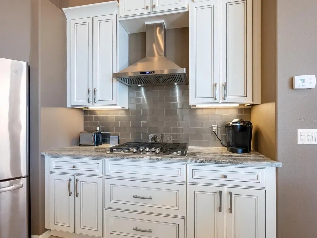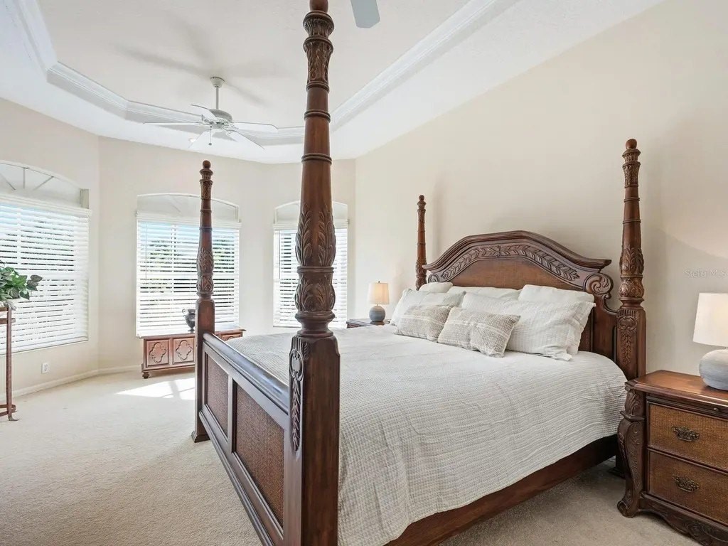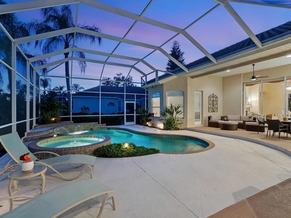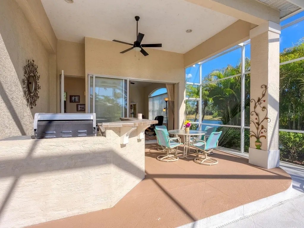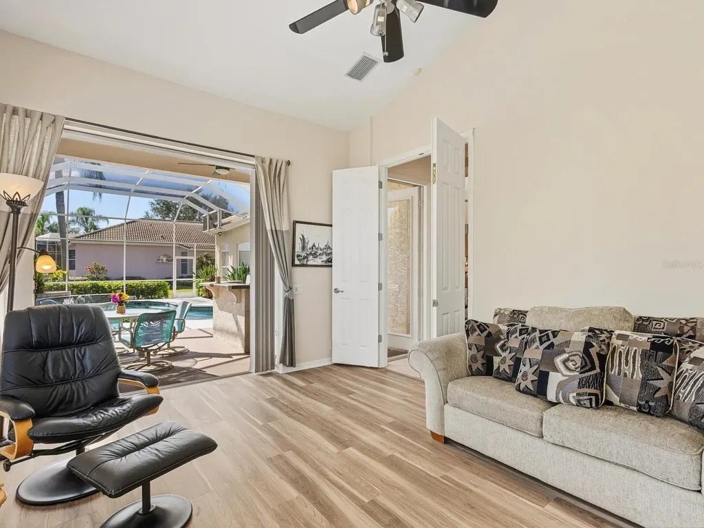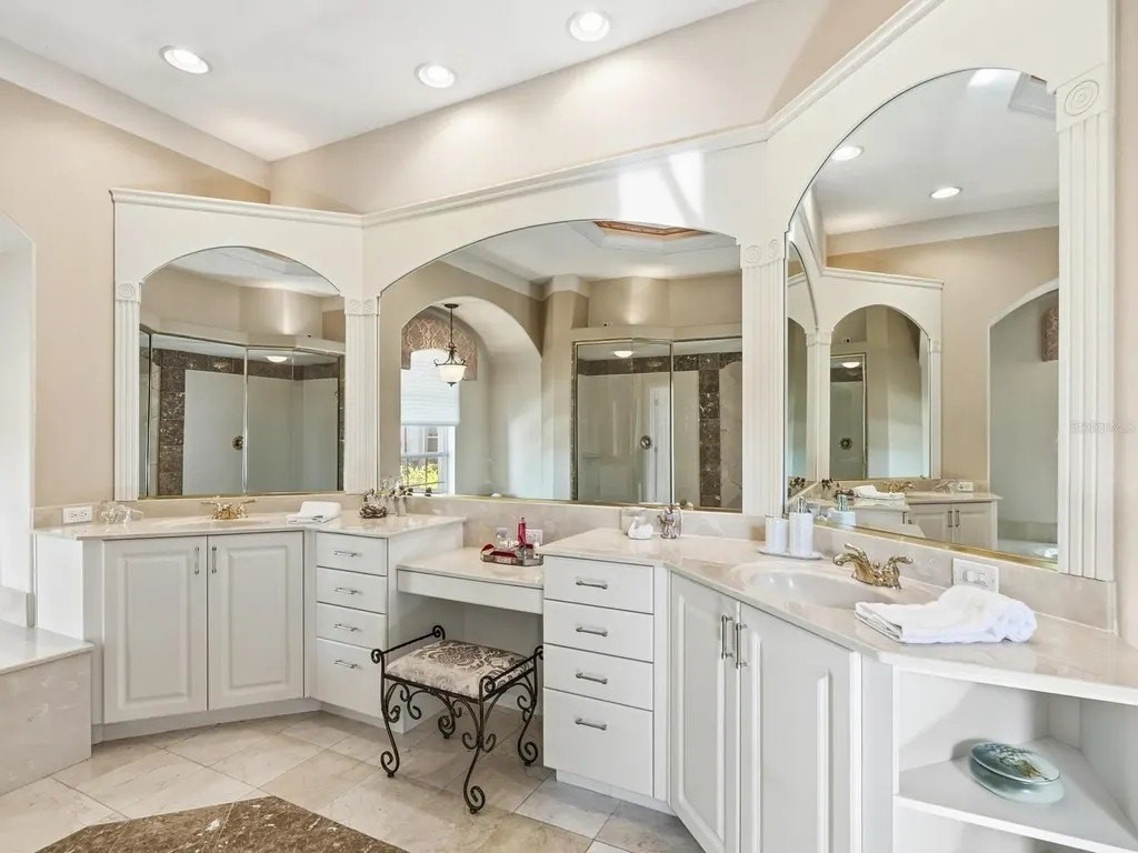 Welcome to this beautifully appointed Neal Custom Homes residence offering serene water views, exceptional architectural detail, and resort-style outdoor living. This 3-bedroom, 3-bath home with an oversized 3-car garage offers 3356 sf and is thoughtfully designed for both everyday comfort and elegant entertaining. A double designer leaded-glass front door opens to a striking foyer with marble inlay flooring, setting the tone for the refined interiors. High-end ceramic tile laid on the diagonal flows throughout the main living areas, complemented by tray and coffered ceiling details, crown molding, custom niches, and recessed lighting. The living room features a triple tray ceiling, an electric fireplace, and pocket sliders that open seamlessly to the lanai. The brand-new kitchen (2021) is the heart of the home, showcasing rich off-white wood cabinetry, exotic granite countertops, a quartz-topped center island, GE stainless steel appliances, subway tile backsplash, under-cabinet lighting, a spacious pantry, built-in oven with microwave, and an aquarium window in the breakfast area. Open to the family room and lanai, this space is ideal for entertaining. The primary suite is a private retreat featuring a sitting area with bay-style windows, coffered ceiling, dual customized closets, double-door entry, and private access to the lanai. The spa-inspired, wheelchair-accessible primary bath offers an oversized marble-detailed shower, Jacuzzi tub, marble flooring, expansive double vanity with makeup area, cultured marble countertops, triple mirrors, and new designer hardware. Bedroom two is a generously sized custom suite with a large closet and bath featuring a cultured marble vanity and tub/shower combination. Bedroom three is adjacent to a full hall bath with enclosed shower, linen closet, and updated brushed-silver fixtures. A large rear den with cathedral-style ceiling and sliders to the lanai can easily serve as a fourth bedroom with the addition of a closet. Step outside to your private oasis with a kidney-shaped heated pool and spa, lush updated landscaping with lighting, and a covered lanai offering space for a future outdoor kitchen (currently equipped with refrigerator and cabinetry). The oversized 3-car garage features higher ceilings, a painted floor, storage cabinetry, exterior access, and an electric hydraulic car lift, perfect for car enthusiasts. Additional highlights include central vacuum, exquisite lighting, select new fans, window treatments, brushed-silver hardware throughout, and a well-appointed laundry room with cabinetry, sink, and built-in ironing board. Available furnishings may be purchased separately.